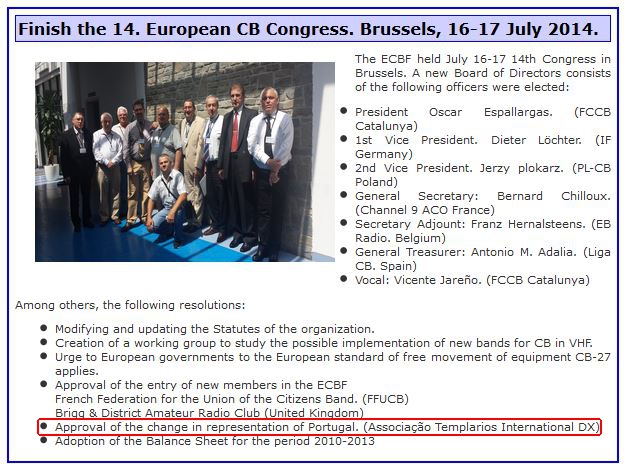 Não conseguimos entender qual a estratégia desta ECBF para com os seus representantes. Em Portugal, o seu representante oficial, é a Associação Templários CB - DX Intencional de Tomar, nomeada em Congresso realizado nos dias 16 e 17 de Julho de 2014, em Bruxelas, conforme fotografia acima publicada.