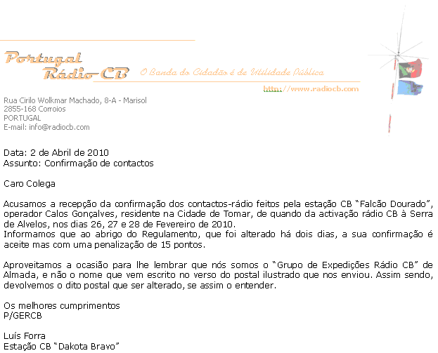 Acusamos a recepção da confirmação dos contactos-rádio feitos pela estação CB “Falcão Dourado”, operador Calos Gonçalves, residente na Cidade de Tomar, de quando da activação rádio CB à Serra de Alvelos, nos dias 26, 27 e 28 de Fevereiro de 2010.